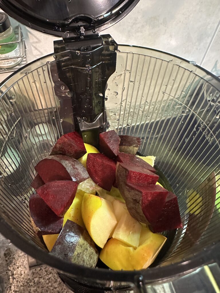 Zu Beginn habe ich Obst und Gemüse noch recht klein geschnitten – reine Gewohnheit aus der Zeit mit unserem alten Entsafter. Doch der AUTO8 ist erstaunlich leistungsstark: Heute gebe ich oft ganze Apfelviertel, Selleriestangen oder große Stücke Rote Bete hinein, und das Gerät bewältigt alles mühelos.
